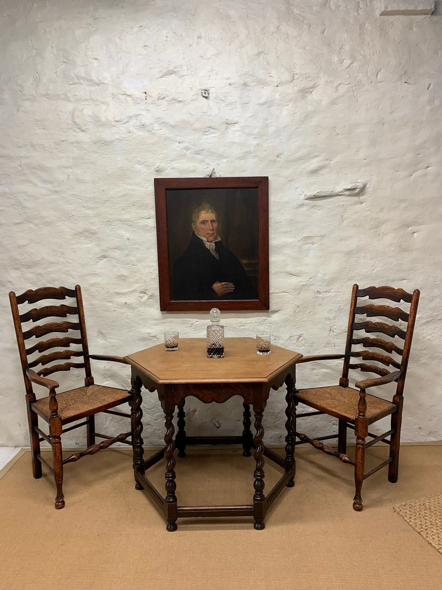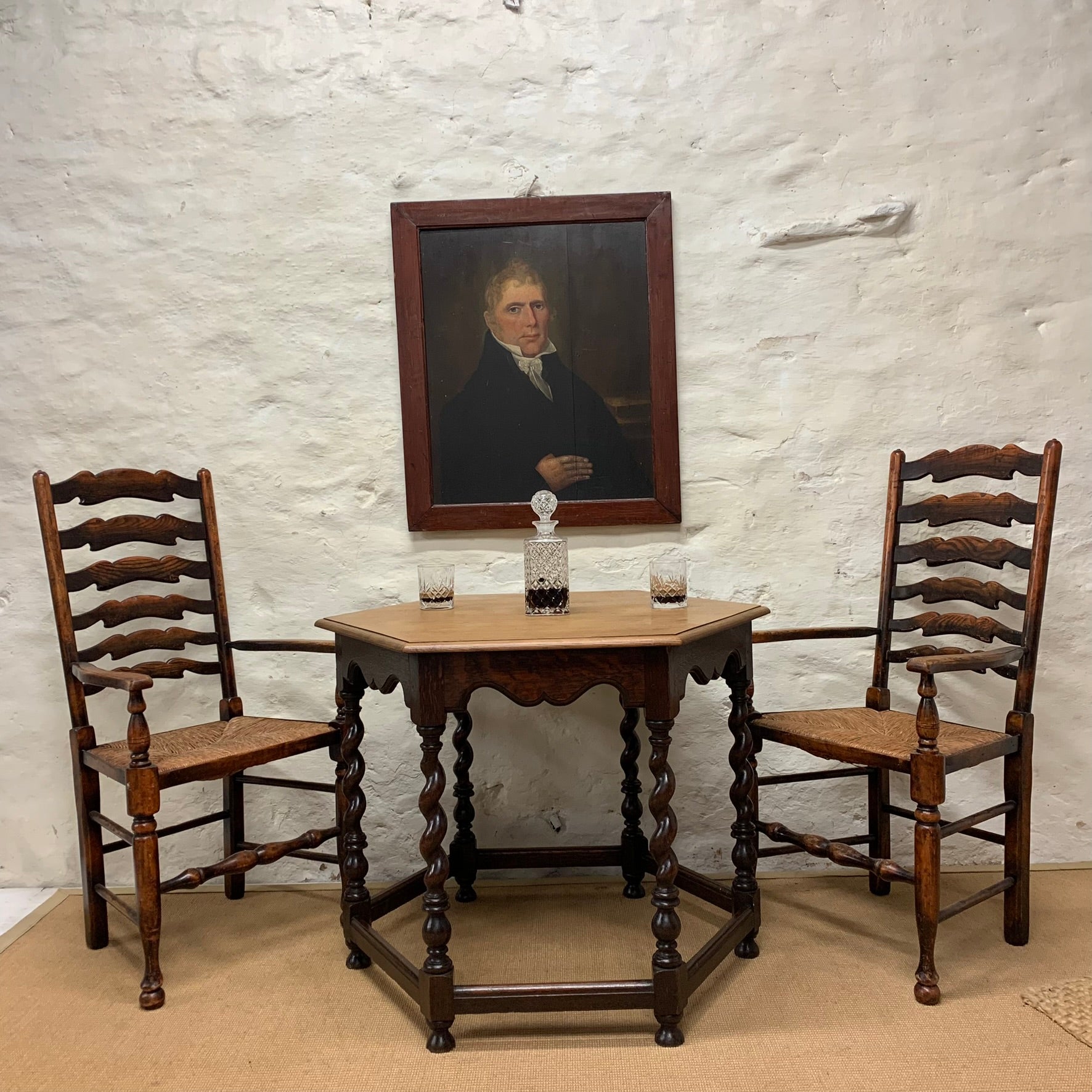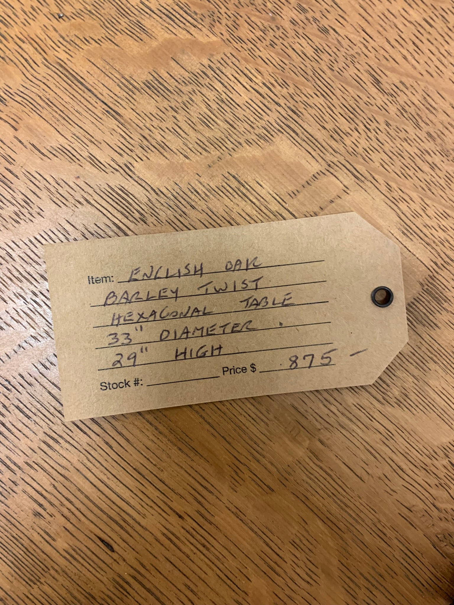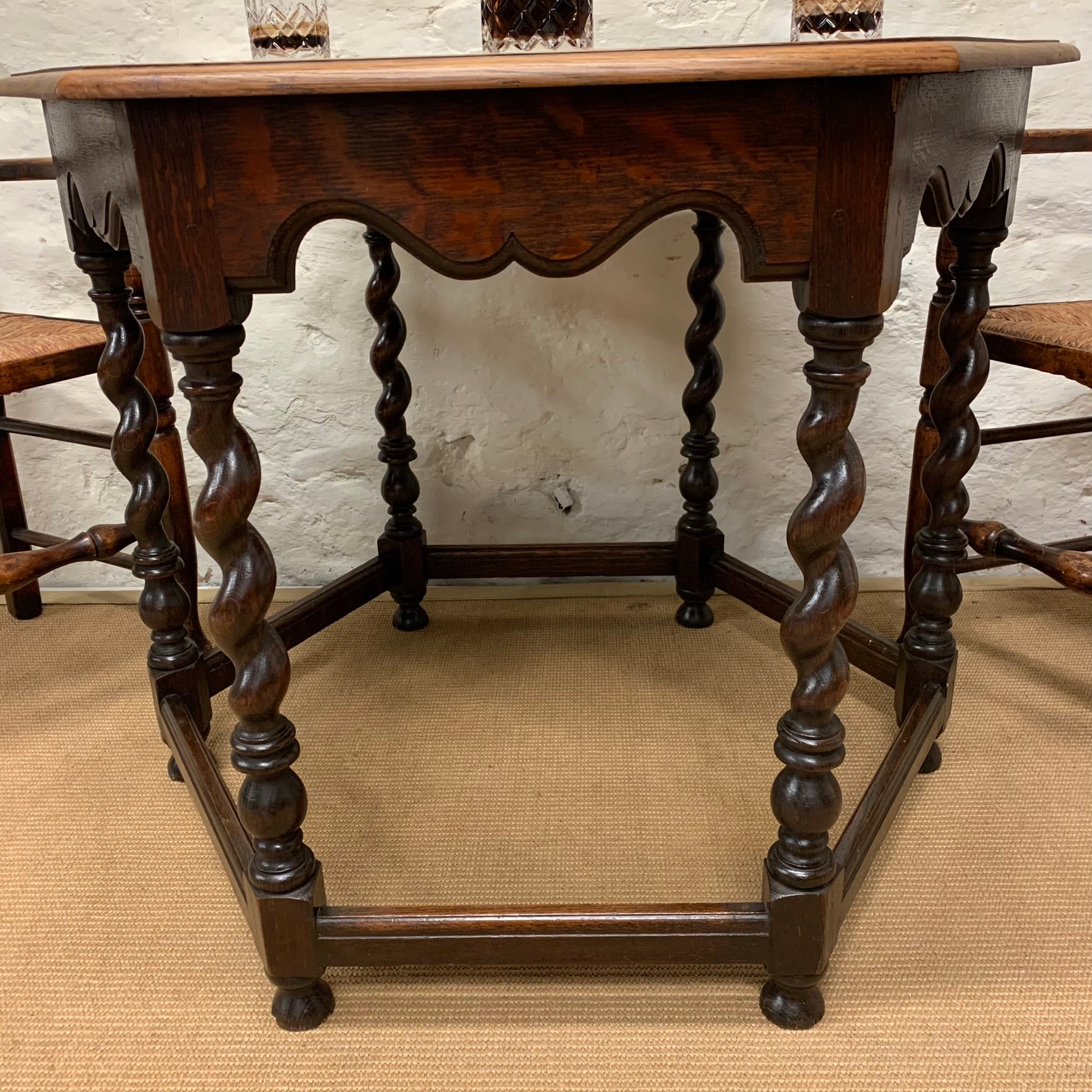 English antique oak hexagonal top centre table with barley twist legs