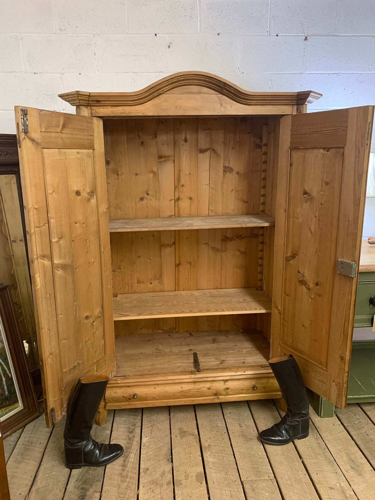 Antique pine 2 door armoire with adjustable height shelves