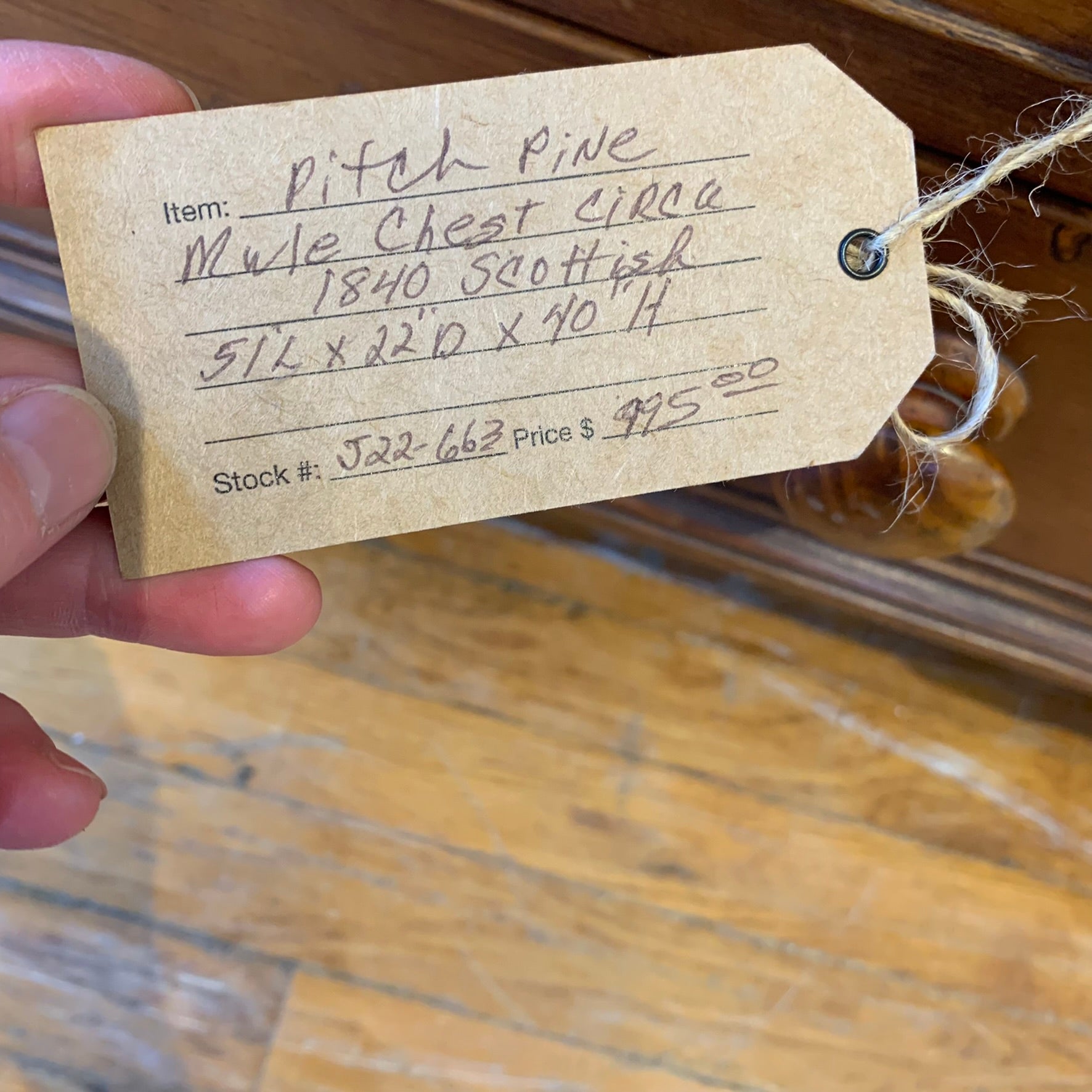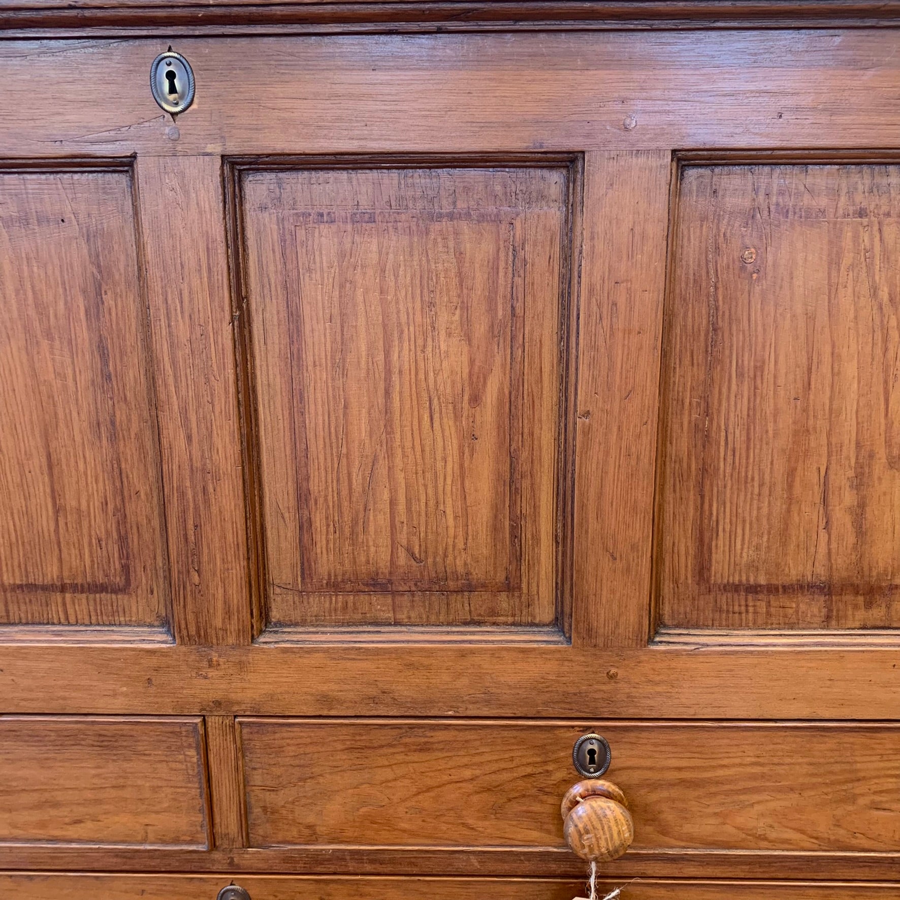 A lovely panel front and sided circa 1840 Scottish Pine mule chest with original knobs and bracket feet. With plenty of storage above and three dovetailed drawers below, this good looking antique chest has been beautifully waxed. A rare, original example.