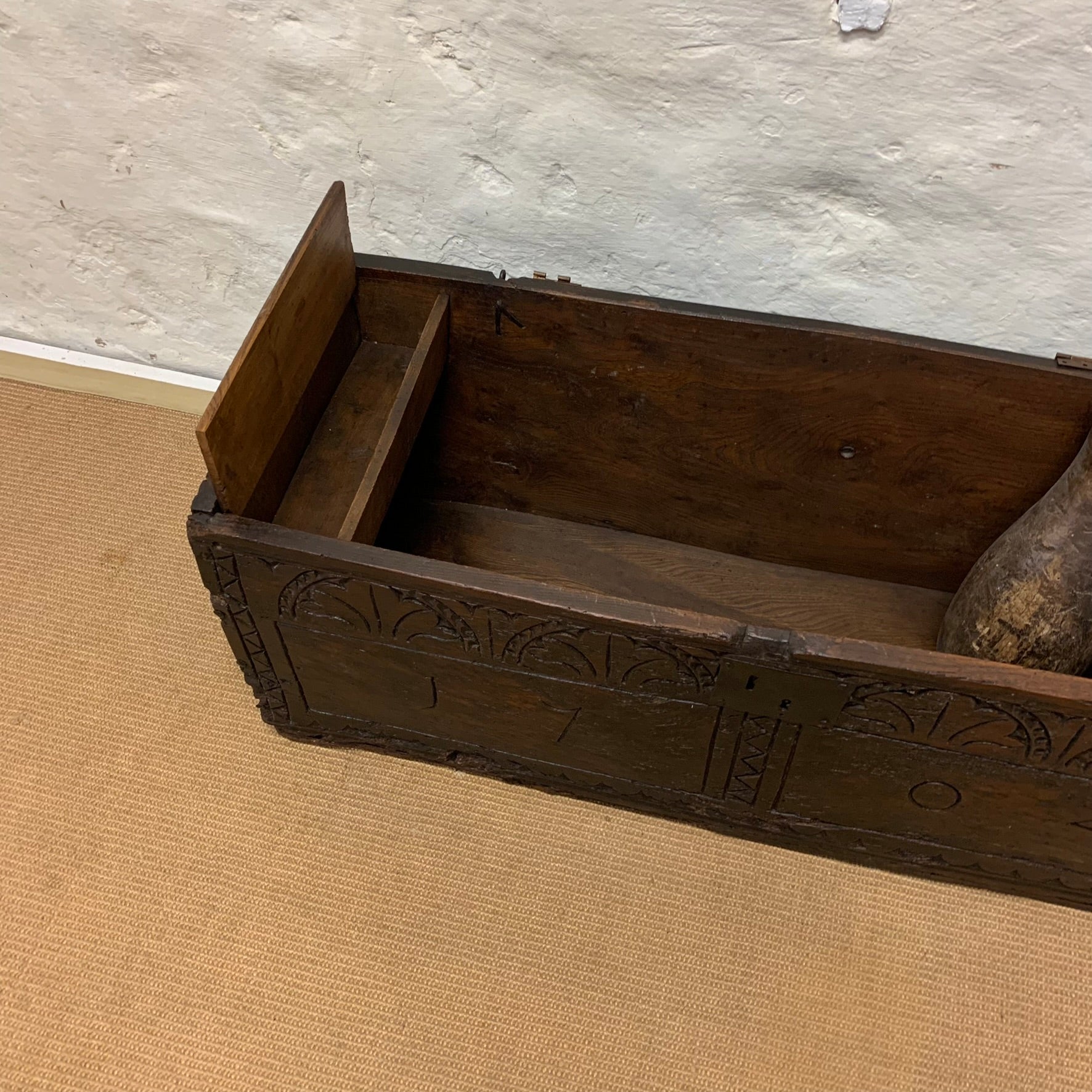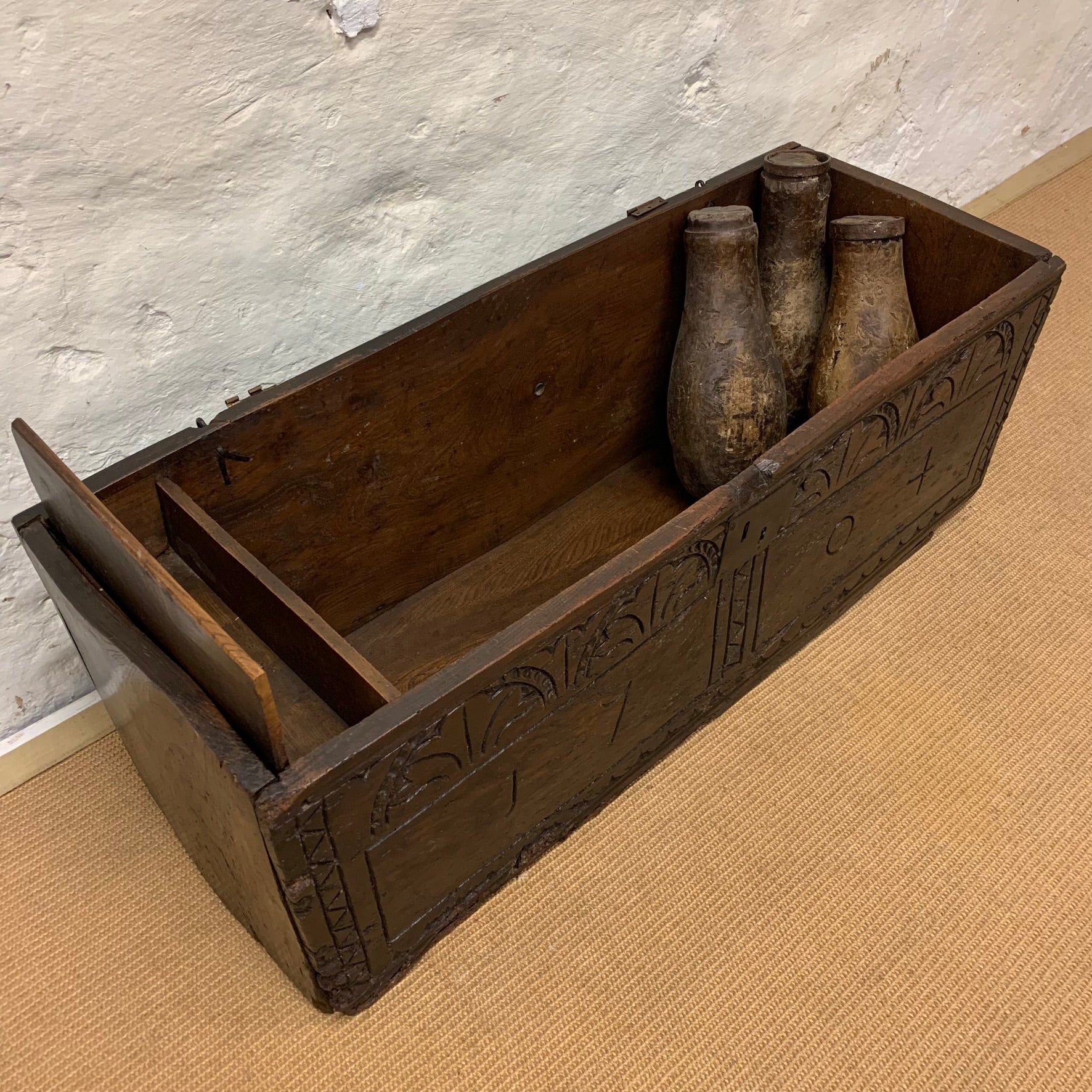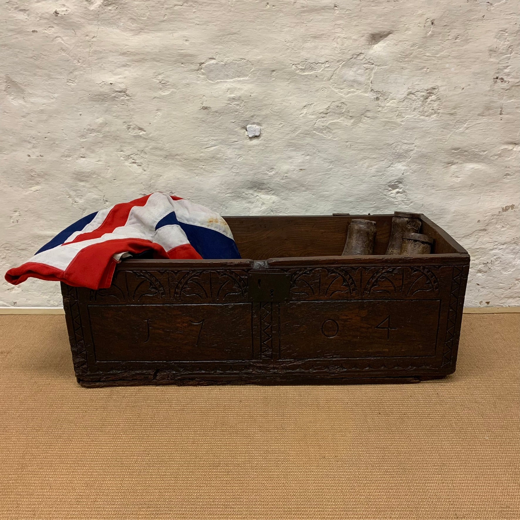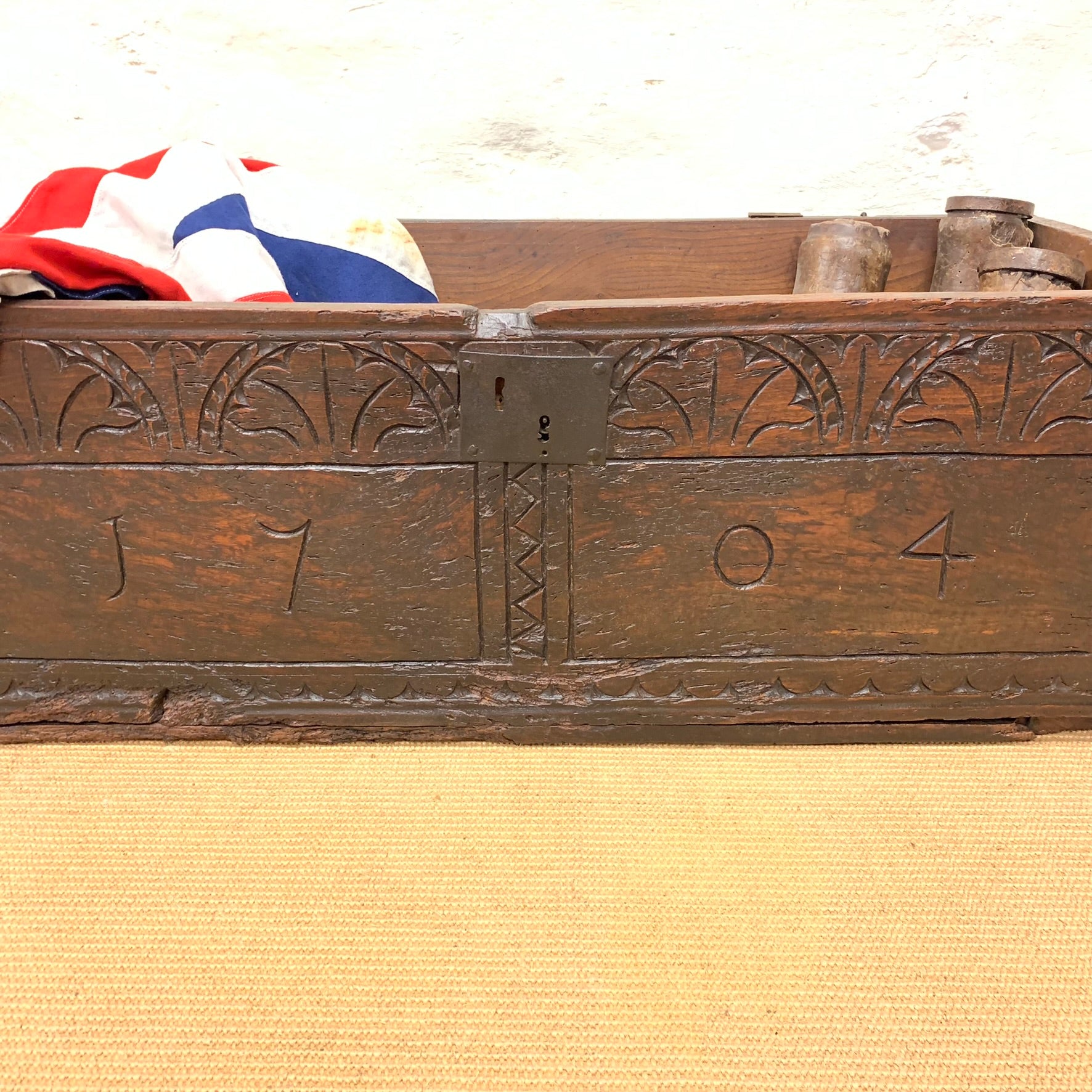 An early English Elm Trunk with detailed carving dating the piece to 1704. A great fireside conversation piece with provenance! Candle drawer remains to interior.