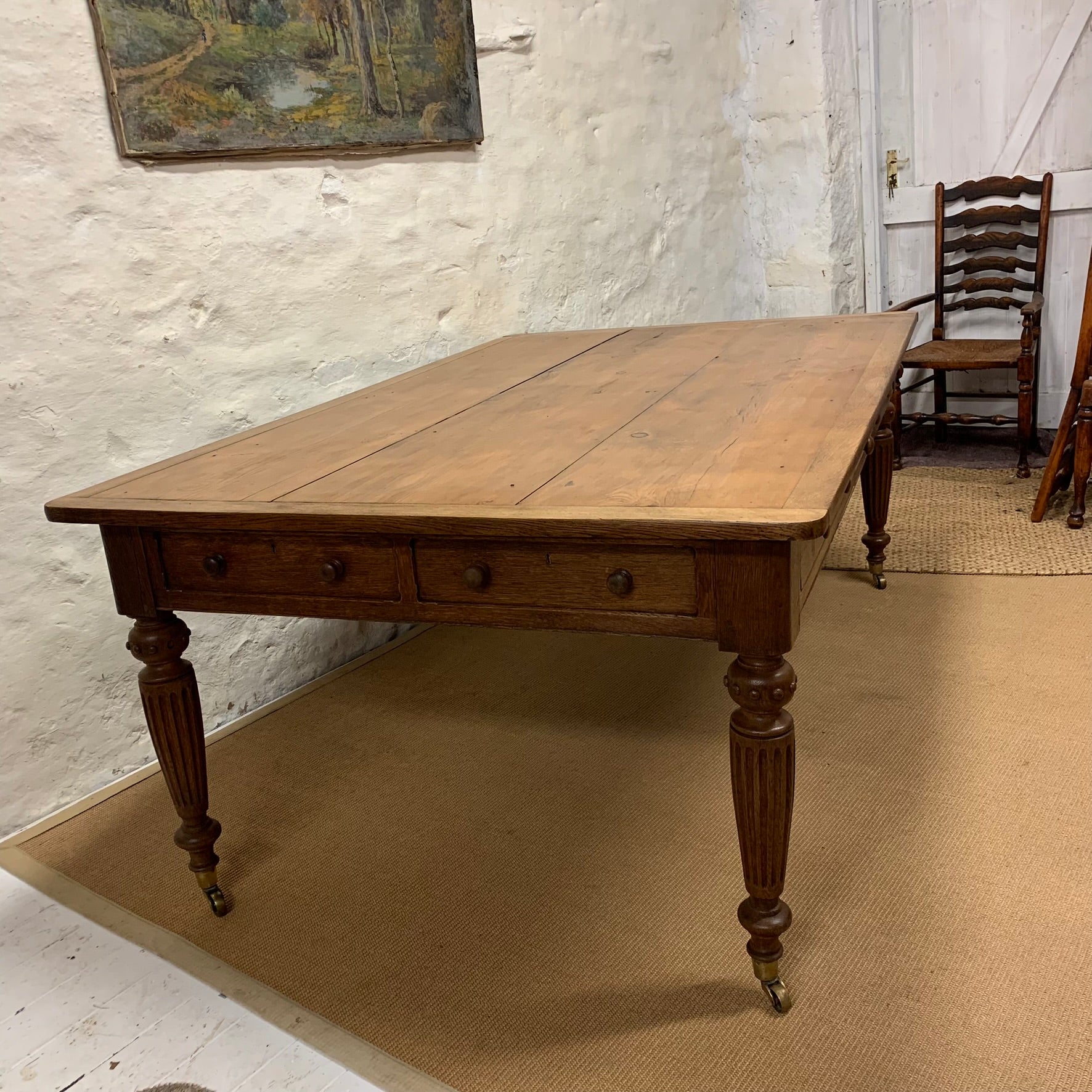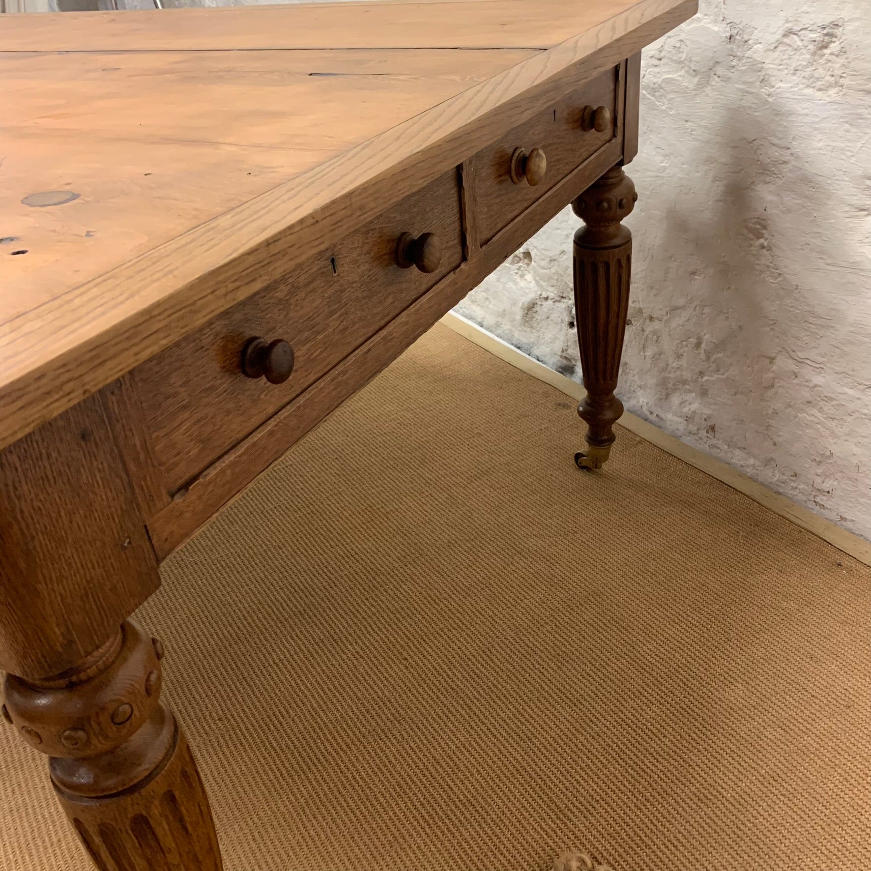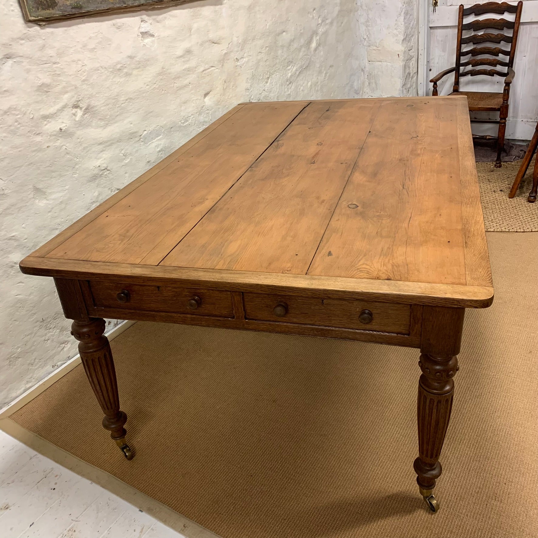 An English Pine and Oak turned leg Library Table with drawers on all sides.