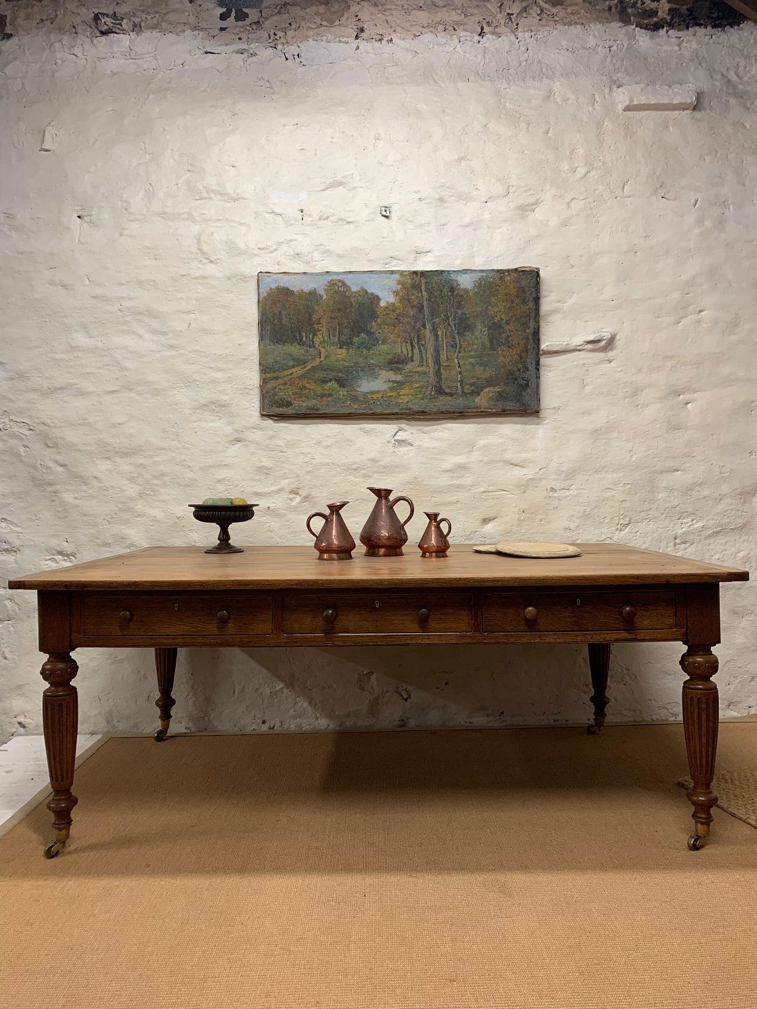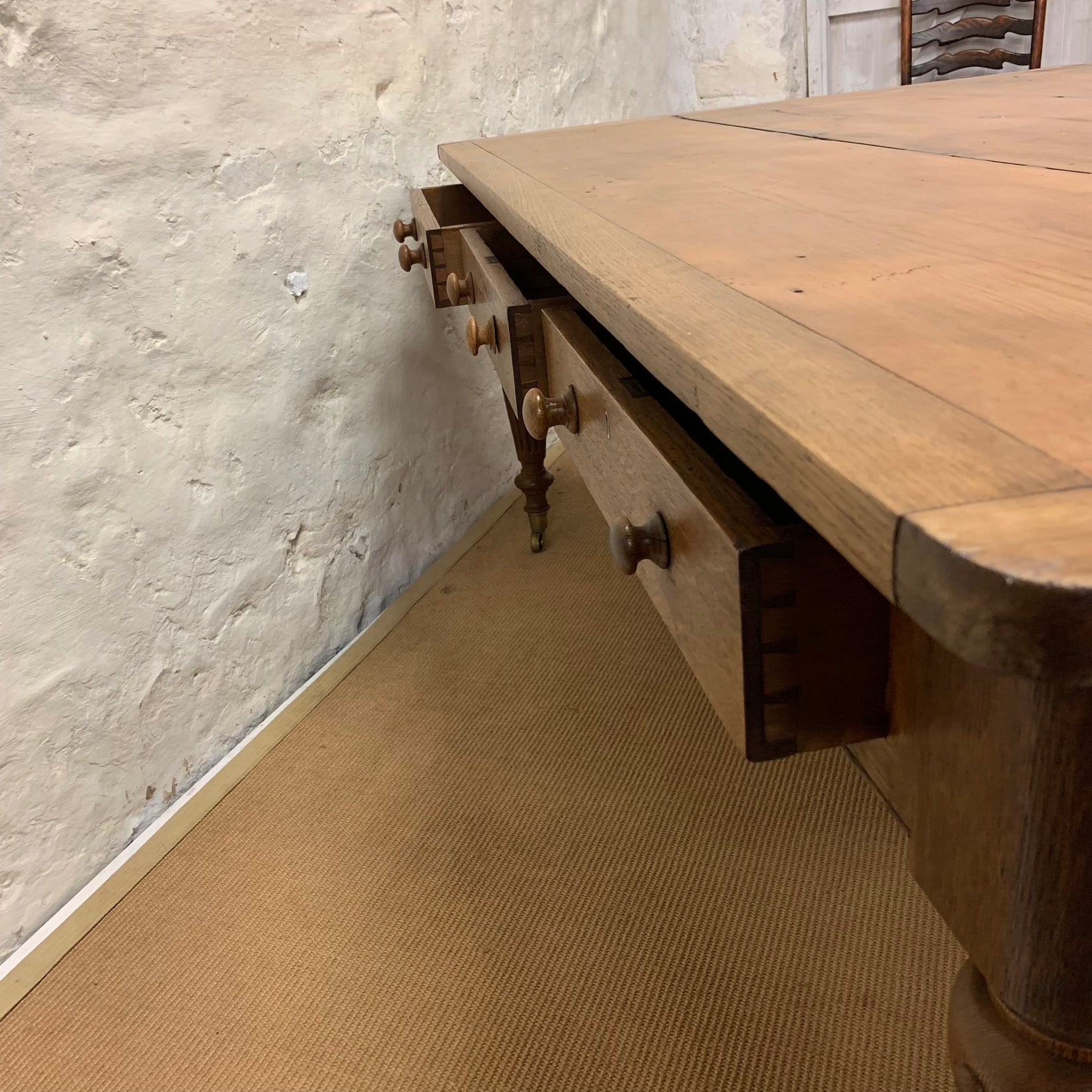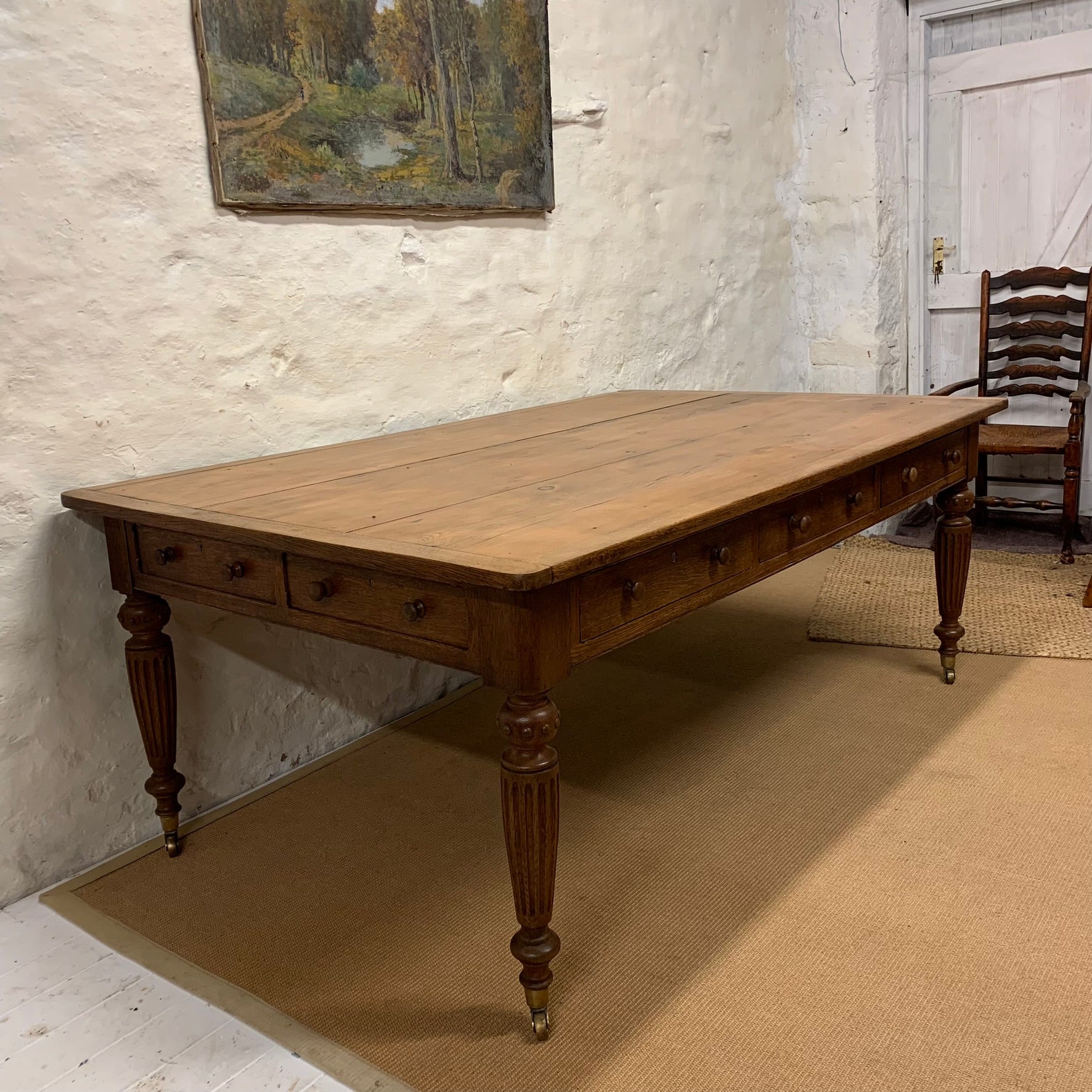 An English Pine and Oak turned leg Library Table with drawers on all sides.